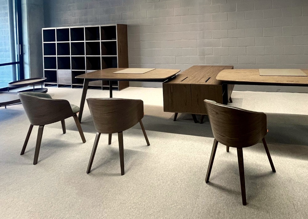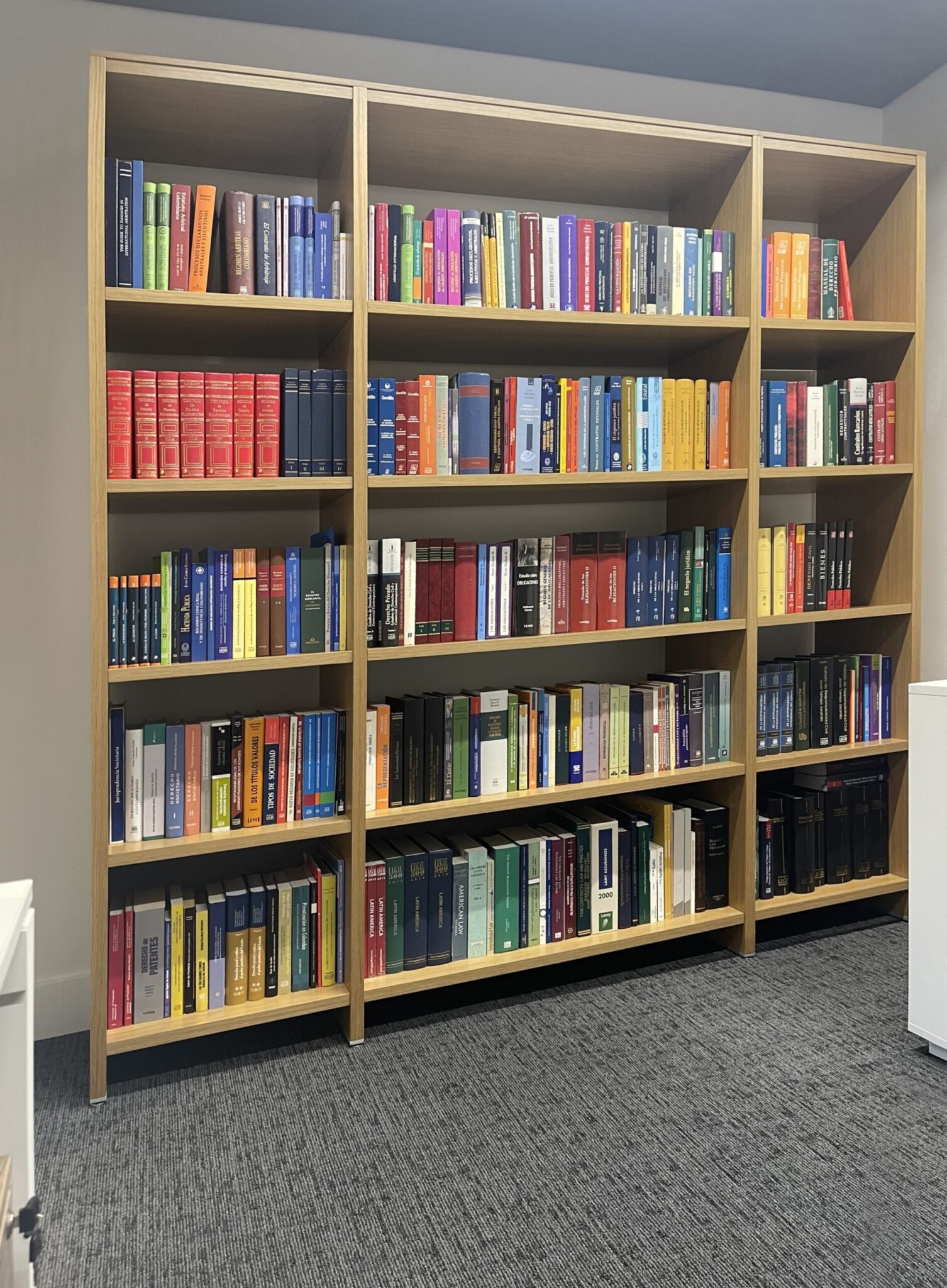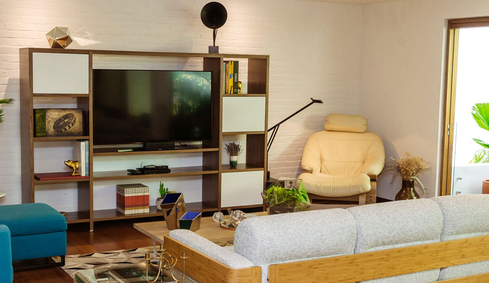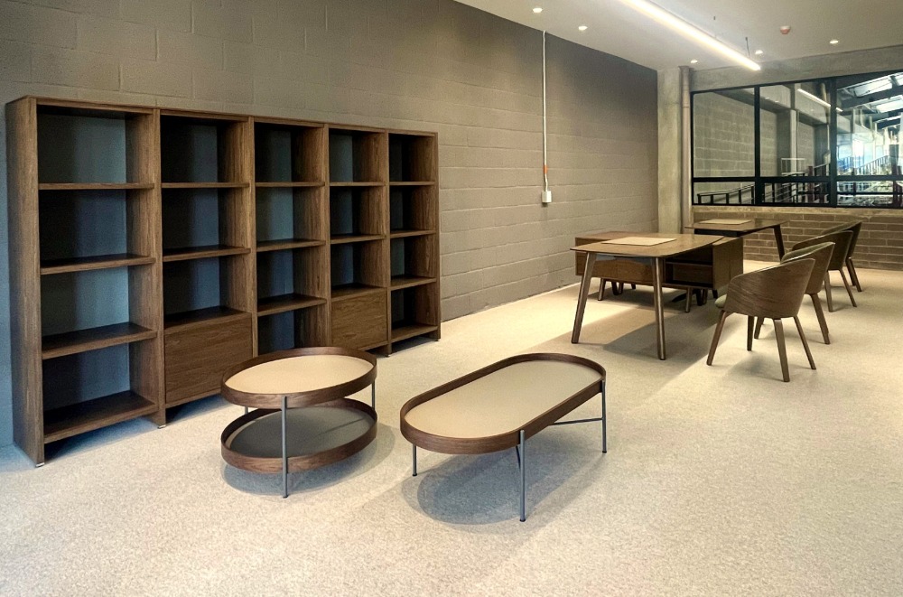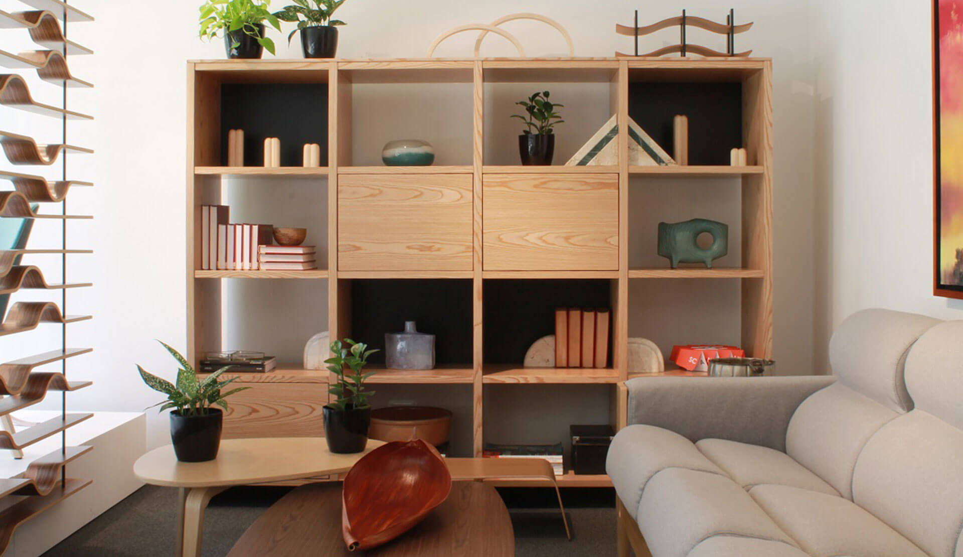 Biblioteca modular fabricada en madera, liviana y funcional, con entrepaños que permiten diferentes graduaciones en sus alturas y alternativas de cajones, puertas de madera. Admite cierto nivel de personalización.