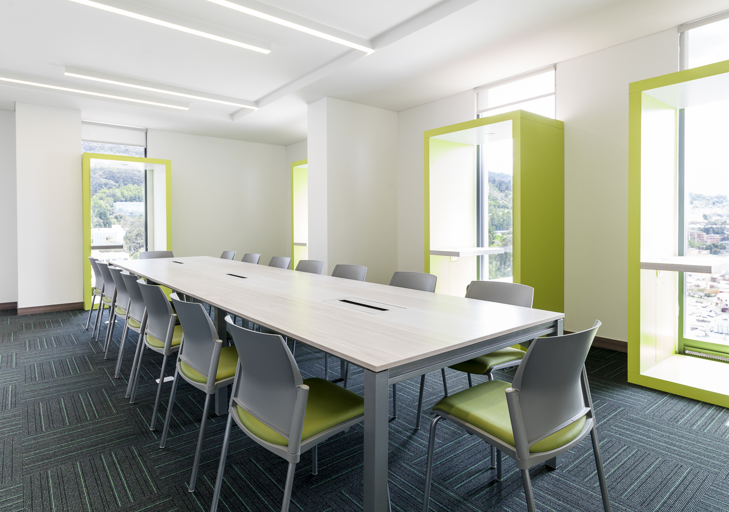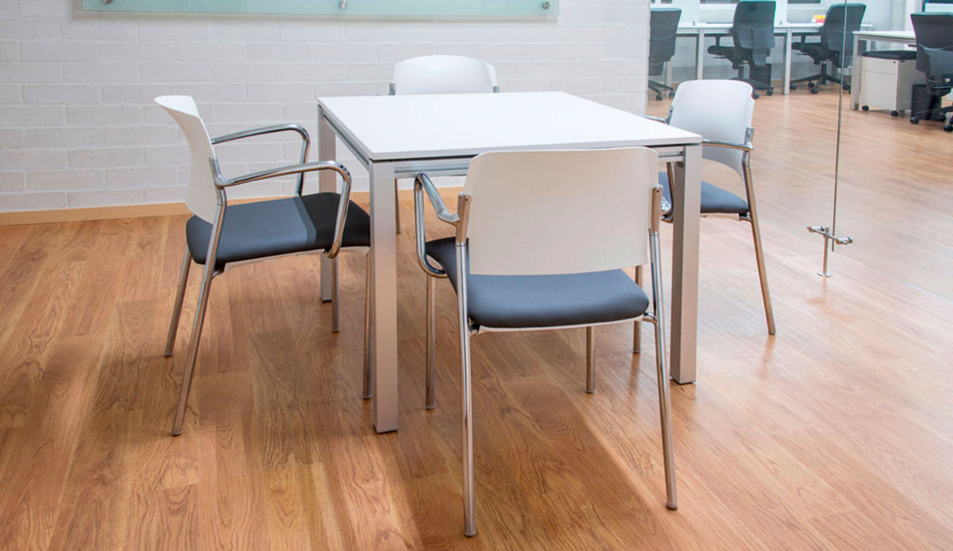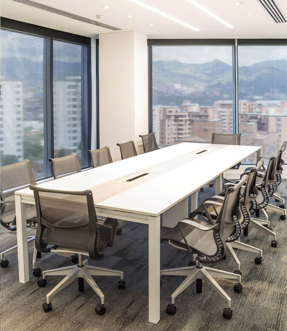Producto de líneas simples con un alto componente estético y funcional que permite generar configuraciones de manera ágil y efectiva. Las superficies en laminado de alta presión. la estructura en perfilería de aluminio extruido y el uso de herrajes para su ensamble la convierten en una línea liviana y fácil de modular.