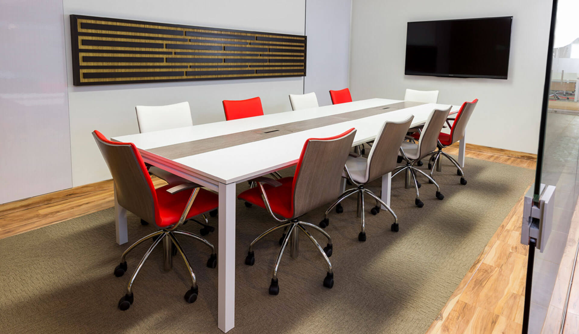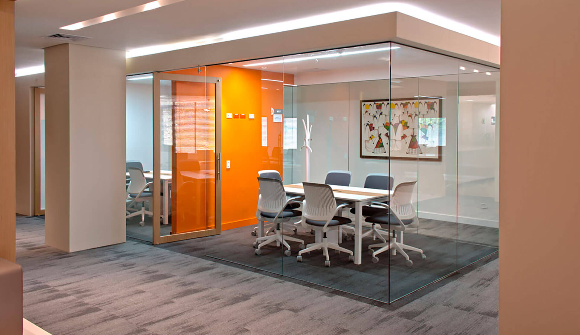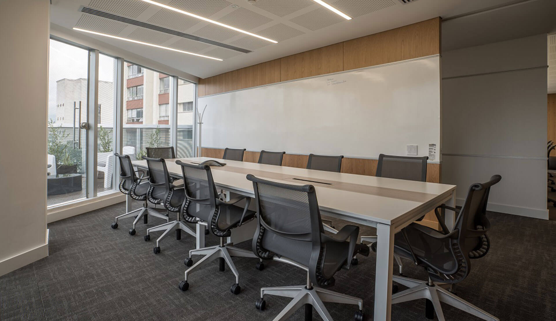 Producto de líneas simples con un alto componente estético y funcional que permite generar configuraciones de manera ágil y efectiva. Las superficies en laminado de alta presión. la estructura en perfilería de aluminio extruido y el uso de herrajes para su ensamble la convierten en una línea liviana y fácil de modular.