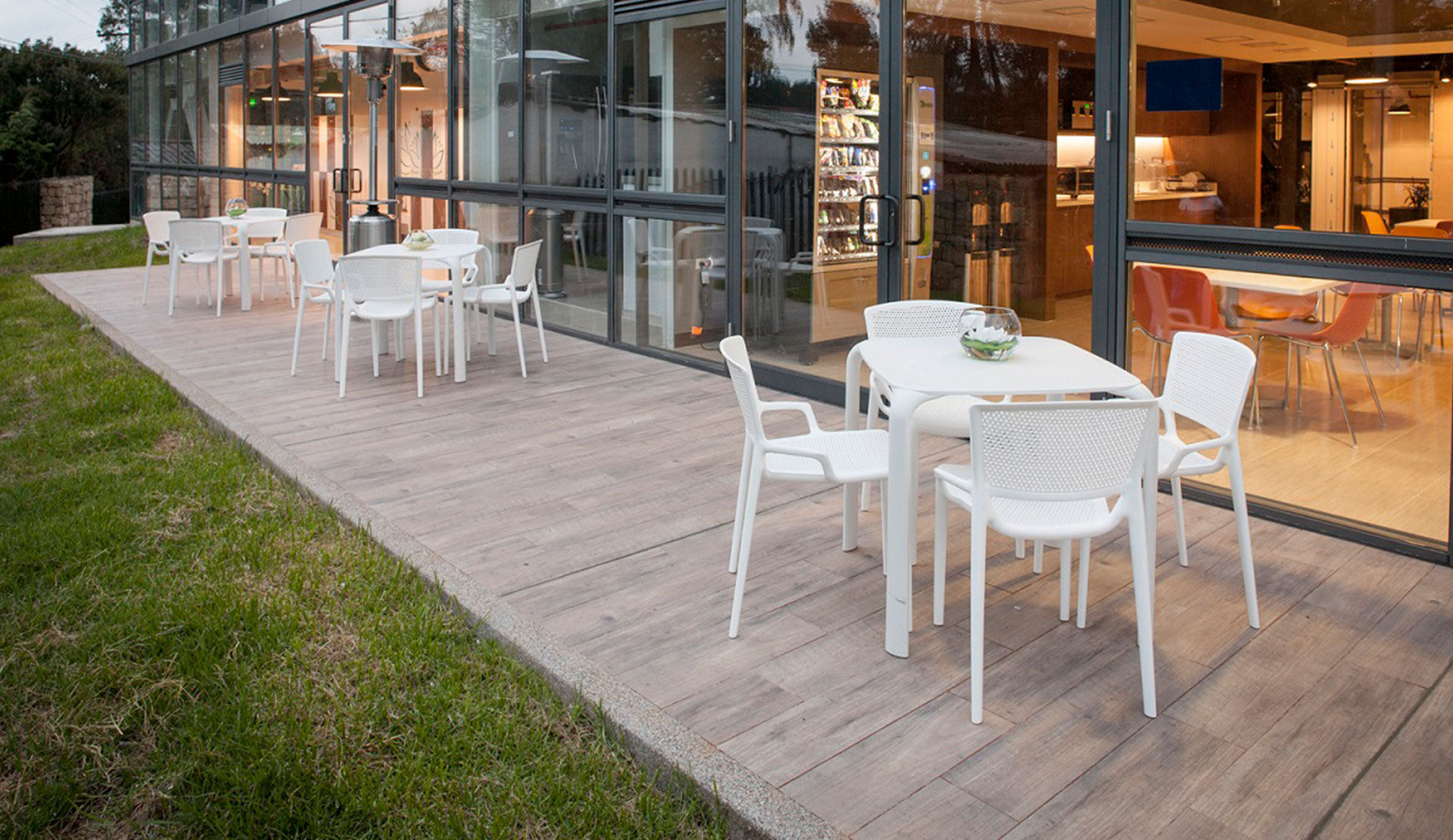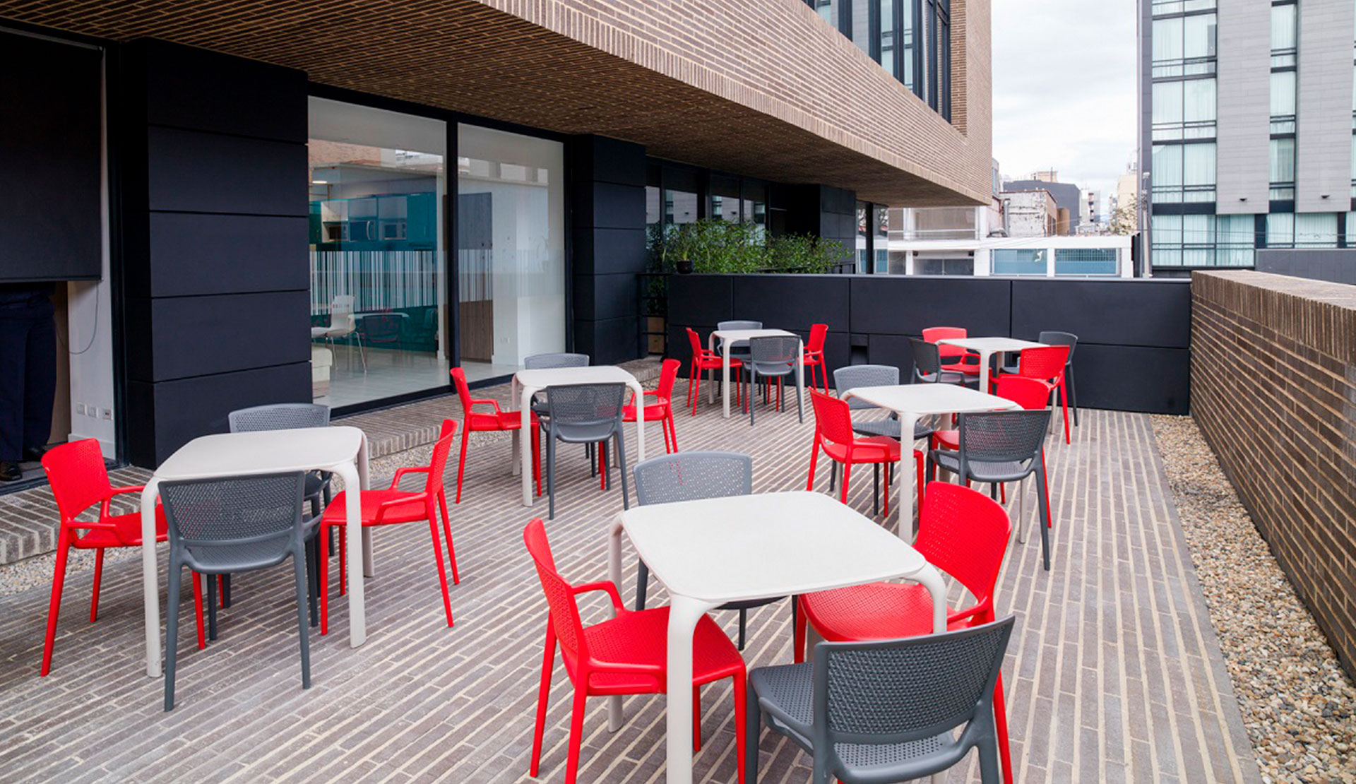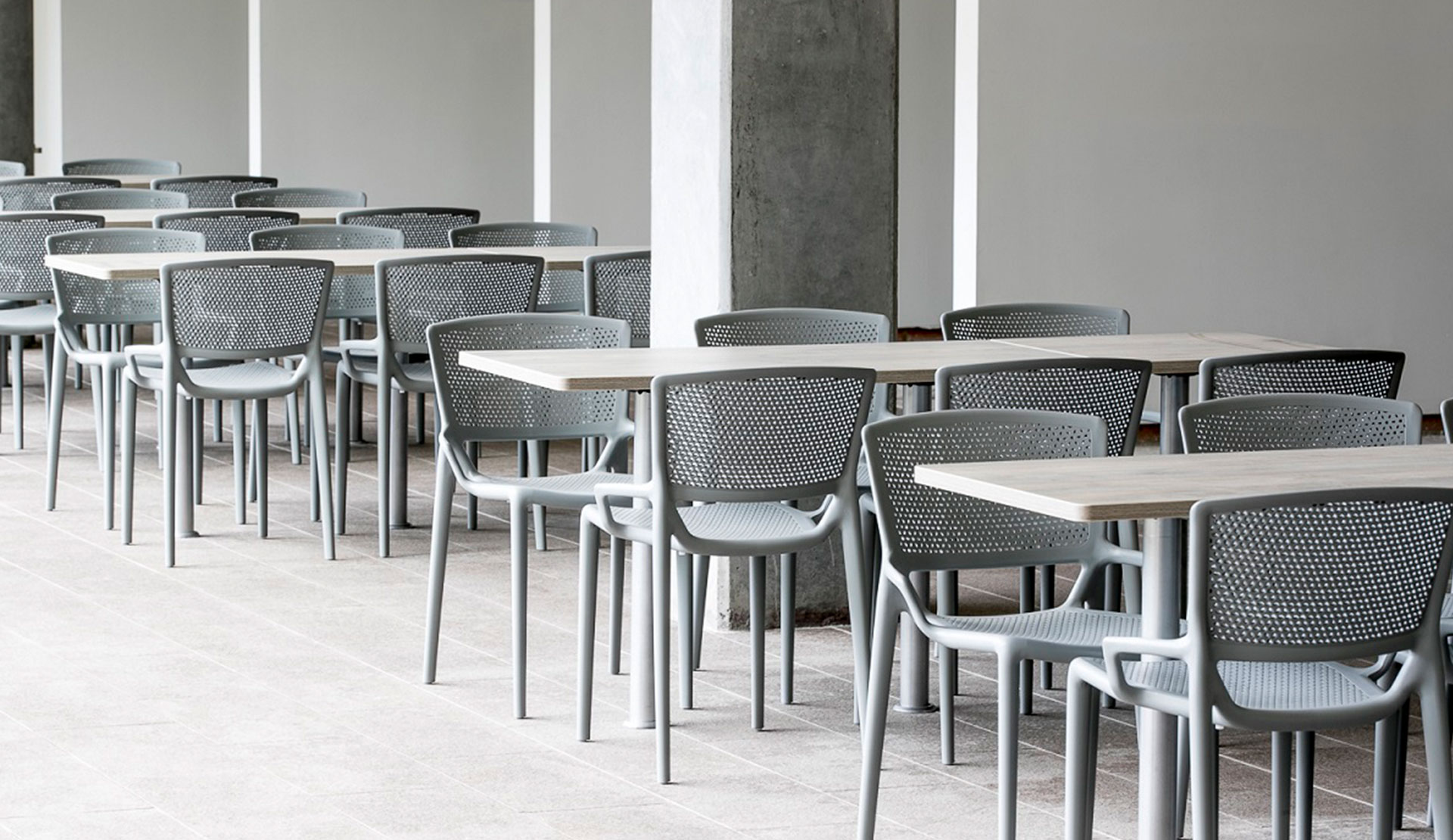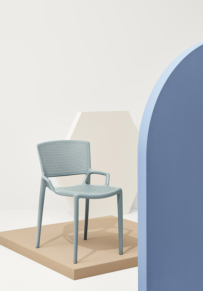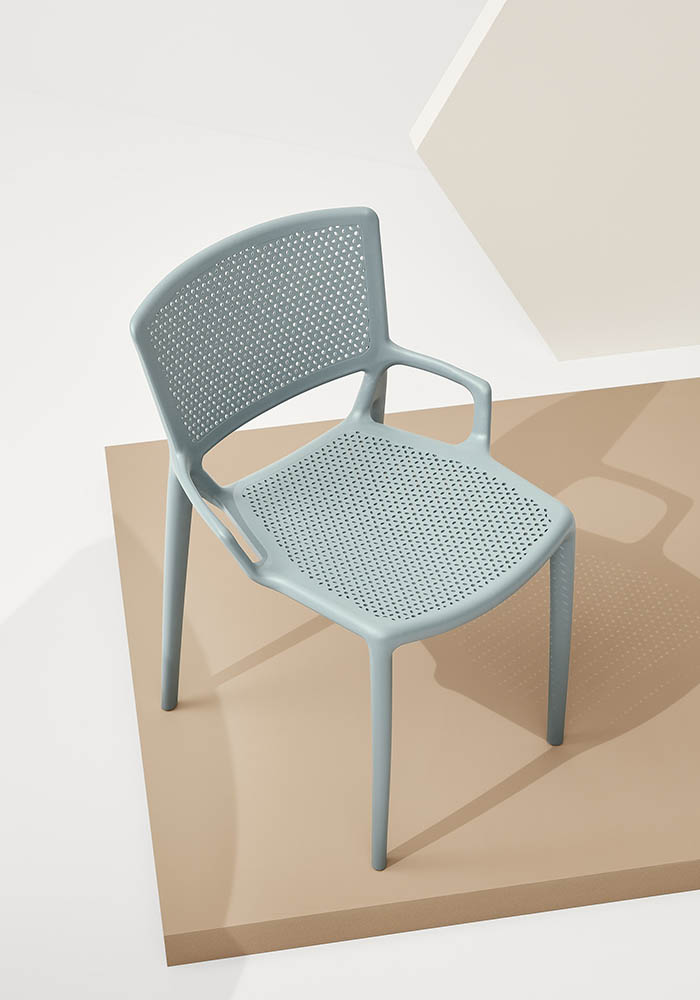 Importada de Italia y apta para exteriores. Fabricada de un solo bloque moldeado por inyección de polipropileno cargado con fibra de vidrio, puede fabricarse con o sin brazos y está disponible con y sin perforaciones en el asiento y respaldo.